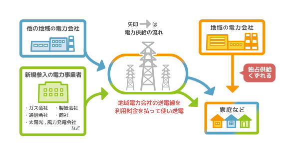 ちょっとお堅い話になってしまいましたが、こうした環境変化で、発電に関する競争ができるようになったのです。ただし、発電事業の自由化後も送電網提供サービスは独占のままで、送電配料金は引き続き規制することになっています。